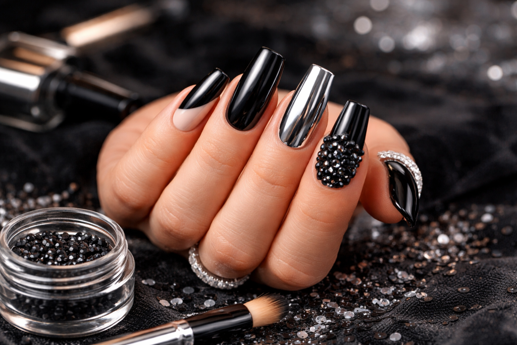 From a nail technician’s perspective, coffin nails are the best shape for detailed nail art. If I am doing chrome powder, encapsulated glitter, 3D gel, rhinestones, or anything layered, coffin gives me the space to build.